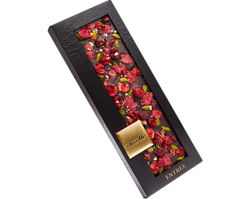 - Chocolate Bar with Gold & Rose Petals - Val dark chocolate 66%, Pistachio from Bronte, Freeze-dried sour cherry pieces, Crystallized rose petals, Genuine 23 karat gold crumbs.