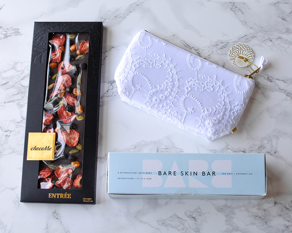 Practical and a little indulgent this gift set makes the perfect gift for a special occasion or just because and will suit any type of lady. A beautifully designed COZE pouch which can be used for anything from makeup storage to a coin purse, is paired with a decadent chocolate bar by ChocoMe, (which is almost too pretty to eat) and rounded out with a box of Bareskin bath bars whose qualities will leave you feeling as if you've spent all afternoon at the spa.